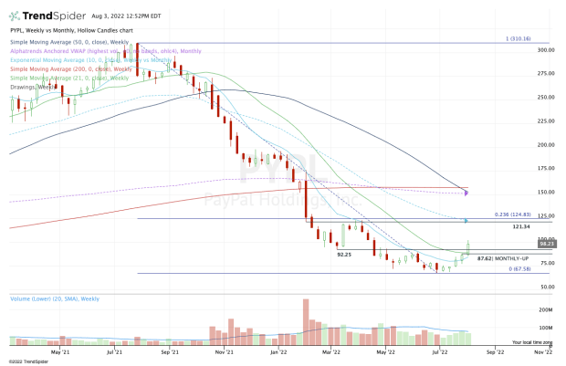 They’d also like to see it take out $100 and continue higher. If we get a continued rally in the stock market — and especially in tech and growth stocks — it puts the $120 to $125 area in play.