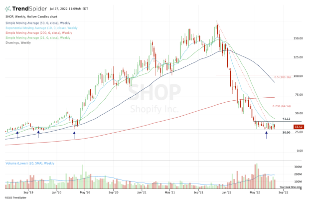 When we return our attention to the charts, it’s clear that the 10-week moving average has been active resistance. The benchmark is currently nearly $36.75, and Shopify bulls are looking for the stock to clear this measure and close above it on a weekly basis.