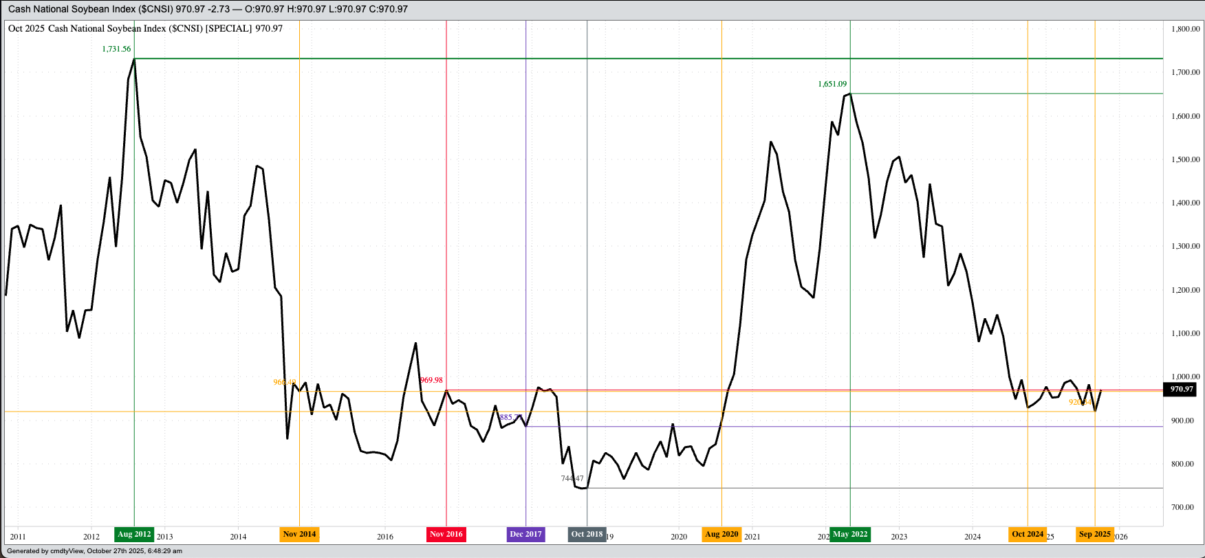 The corn market was also in the green pre-dawn Monday, likely pulled higher on spillover buying from soybeans. Something I forgot to mention in the Commentary above is both corn and soybeans show a seasonal tendency to rally during October, so the fact both markets have eventually moved higher this month isn’t a big surprise. Is it due to the US government insurance harvest price being calculated during October, with daily closes running well below what was seen as the base price was set this past February? Possibly. What about the intrinsic value of the corn market? The National Corn Index ($CNCI) was calculated last Friday at $3.84, just above its previous 5-year low end of October settlement of $3.78 from 2020 and not that much different than October 2024’s October price of $3.82. Based on the economic law of Supply and Demand we can say US corn market fundamentals are about the same as last year and nearly the most bearish it has been in five years. But I understand few want to look at that reality when the US president continues to tell them how well they are doing, all because of how great he is. A lesson those in the feeder cattle industry are now learning.