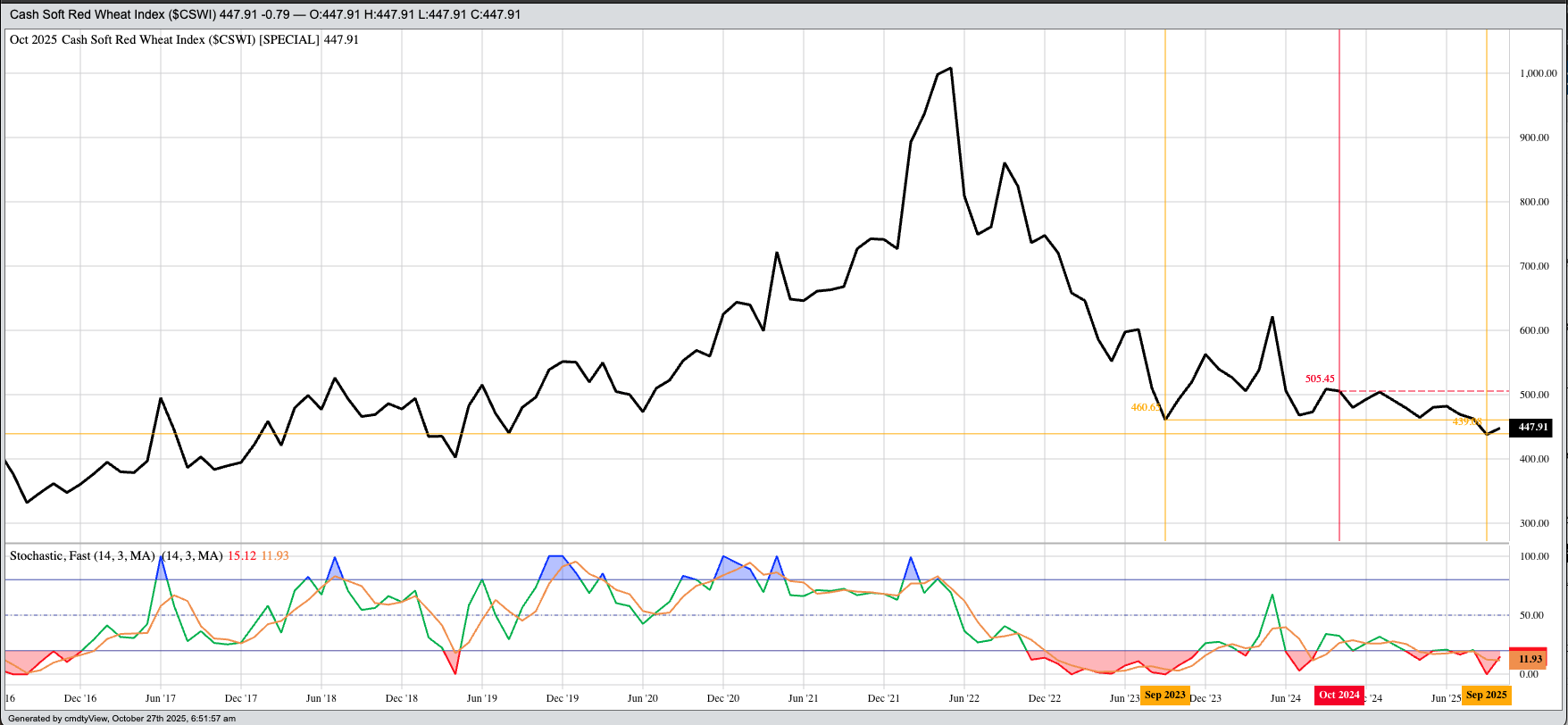 Boats heading to China are obviously lined up stem to stern at US port facilities waiting to load wheat. Right? I’m sure that will be the narrative from the BRACE Industry early Monday morning, at least those few who actually look at the US wheat sub-sector. After all, December SRW is up 9.25 cents at this writing after rallying as much as 12.0 cents overnight on trade volume of 20,000 contracts while Dec HRW gained as much as 12.25 cents and December HRS gained as much as 9.0 cents through pre-dawn Monday. Again, I’ll waste time by pointing out the reality that all three National Cash Indexes are at or well below previous 5-year low end of October price levels confirming US supplies far outweigh demand for those bushels. But that doesn’t matter, right? Not when we are told how great everything is? Just like the fine folks in North Korea. On another note, driving through the US Southern Plains this past weekend I can confirm Texas, Oklahoma, and Kansas received a good deal of rain. Just what the newly planted 2026 HRW crop needed heading into winter dormancy. But who cares about the weather these days?