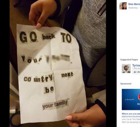 A Polish community centre in north London was daubed in racist graffiti in the weekend following the vote and a Facebook album called "Worrying Signs" has recorded the tweets of people witnessing – and being subjected to – harassment and even violence.