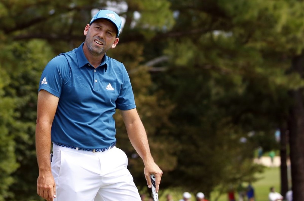Sep 24, 2017; Atlanta, GA, USA; Sergio Garcia reacts to his putt on the fifth green during the final round of the Tour Championship golf tournament at East Lake Golf Club. Mandatory Credit: Butch Dill-USA TODAY Sports