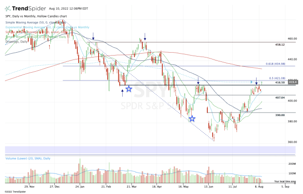 As much as I want to champion the SPY’s ability to clear $416.50 resistance, this other area is noteworthy to me. On the plus side, a move above $421 could unlock a move to the $432 to $435 area.