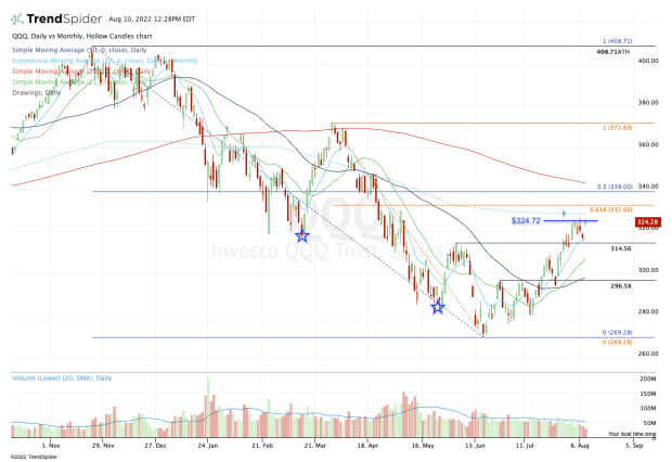 The ETF has continued to struggle with the $324.72 level — last week’s high. Bulls need to see the QQQ clear this level and if it can, it will quickly put the 10-month moving average in play.