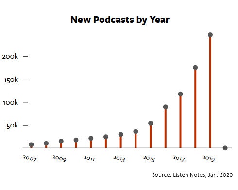 The podcast gold rush has been booming for some time, and if last year is any indication, things won’t be slowing down anytime soon. A record number of podcasts debuted in 2019, according to podcast search engine Listen Notes. Nearly 250,000 new shows debuted last year — almost double the number that launched in 2018.