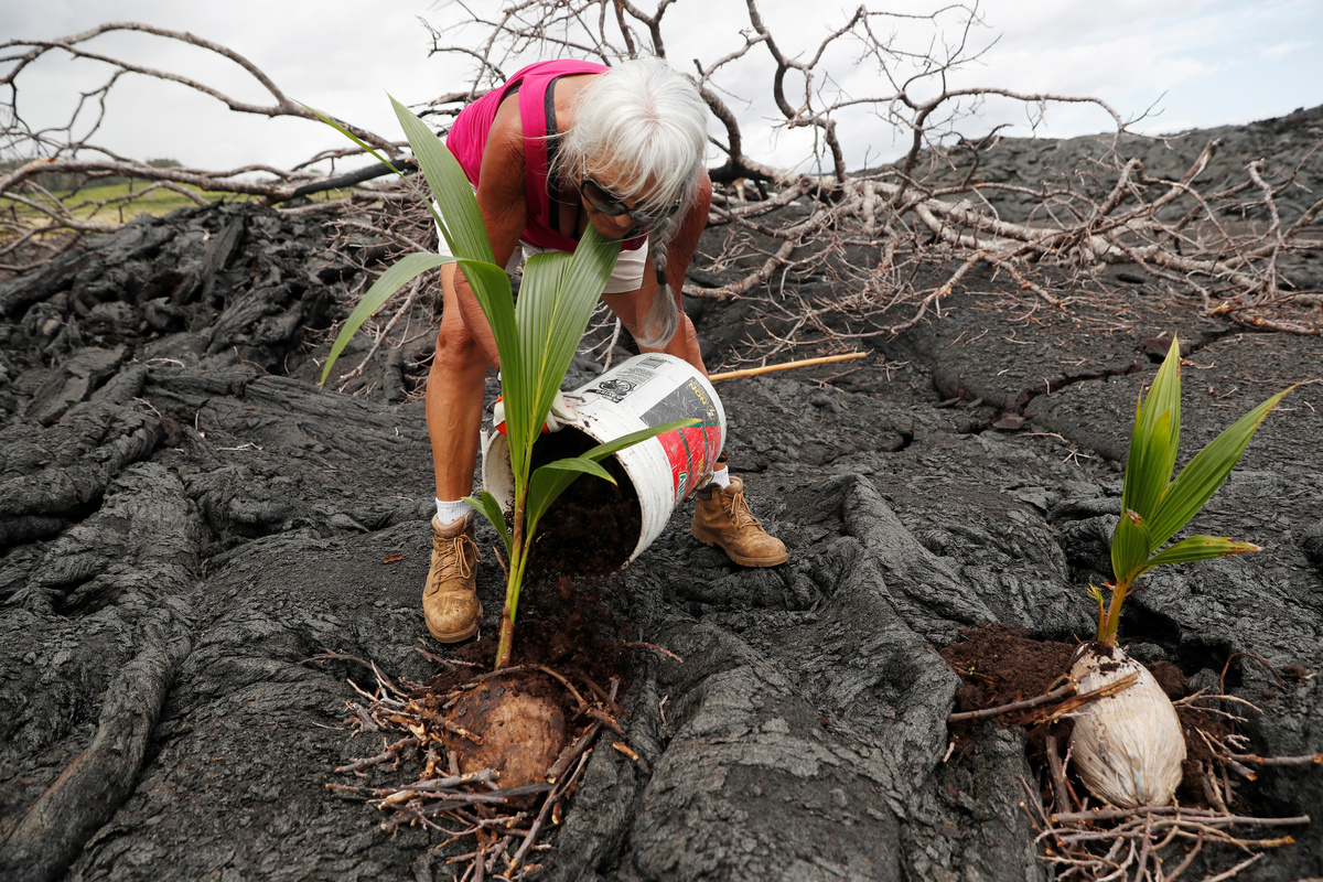 Diane Cohen, 64, who was forced to leave her home when the Kilauea Volcano erupted and covered it with lava last summer, plants a coconut tree on her property in Kapoho, in Hawaii, U.S., April 1, 2019. Picture taken April 1, 2019. REUTERS/Terray Sylvester