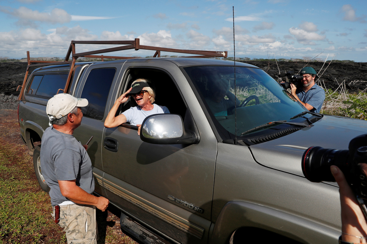 Diane Cohen, 64, of Kapoho, who was forced to leave her home after the Kilauea Volcano erupted last summer, waves to a friend while returning to Kapoho, in Hawaii, U.S., April 1, 2019. Picture taken April 1, 2019. REUTERS/Terray Sylvester