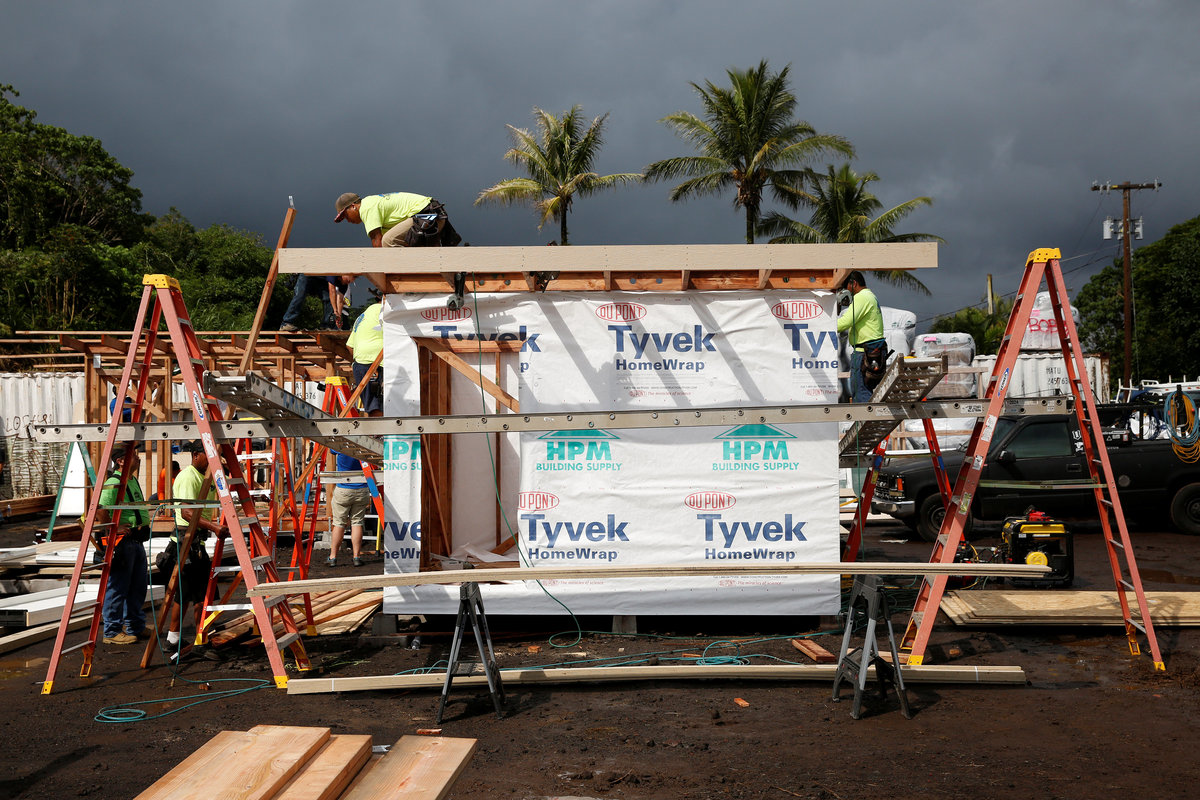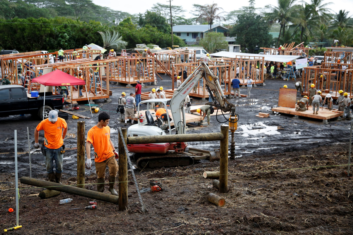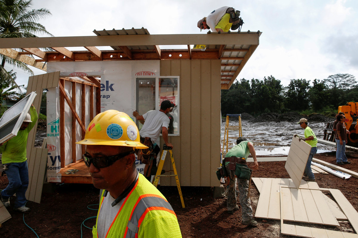 PAHOA, Hawaii (Reuters) - Hundreds of construction workers hammered together 20 temporary housing units on Saturday for families forced from their homes by Hawaii's erupting Kilauea Volcano in what Hawaii County Mayor Harry Kim called a source of hope.