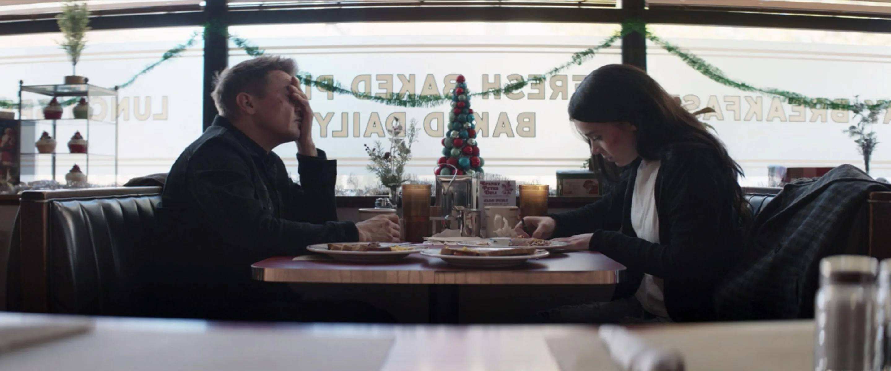 After escaping the Tracksuit Mafia and Echo, Clint and Kate reconvene at a diner. She once again brings up his problem with branding, sketching out a rudimentary costume for him. He scoffs at it (despite it being his iconic outfit from the comics) and offers three reasons he can’t wear a flashy purple suit: