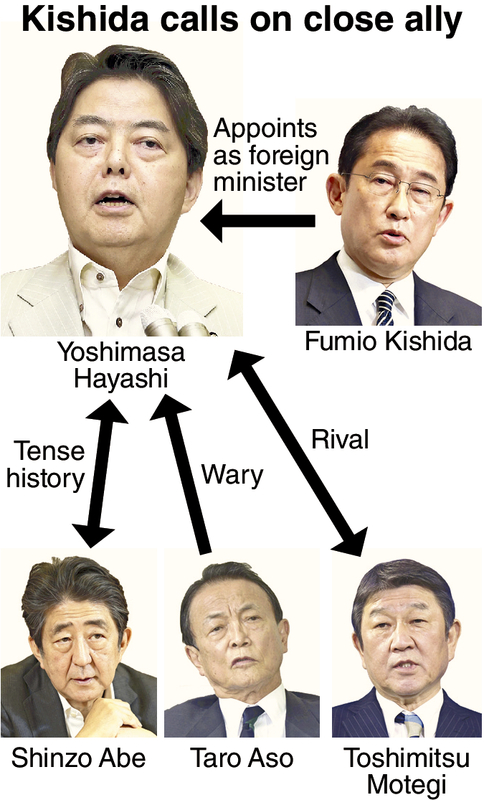 Prime Minister Fumio Kishida picked close ally Yoshimasa Hayashi as foreign minister in the Cabinet inaugurated Wednesday despite reservations on the part of former Prime Minister Shinzo Abe and Liberal Democratic Party Vice President Taro Aso.