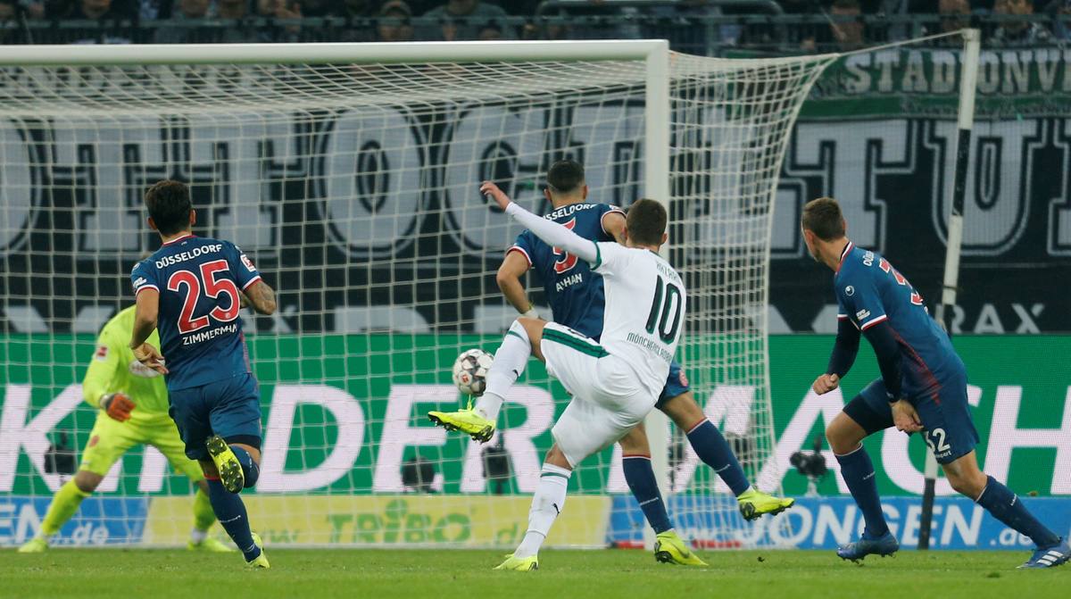 Soccer Football - Bundesliga - Borussia Moenchengladbach v Fortuna Duesseldorf - Borussia-Park, Moenchengladbach, Germany - November 4, 2018 Borussia Monchengladbach's Thorgan Hazard scores their third goal REUTERS/Leon Kuegeler