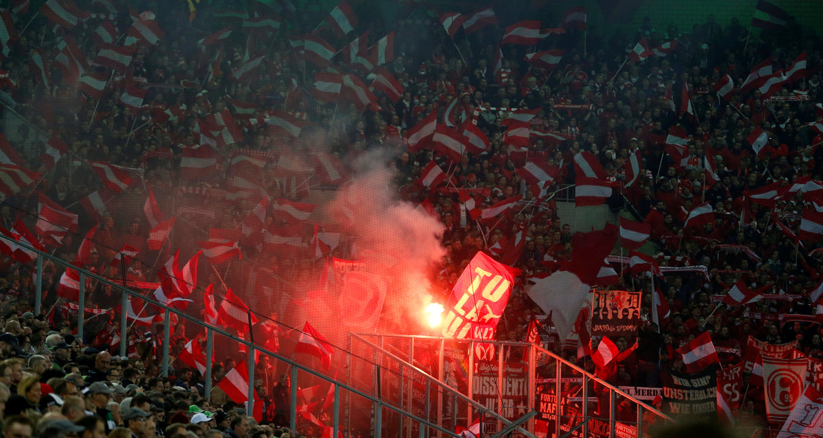 Soccer Football - Bundesliga - Borussia Moenchengladbach v Fortuna Duesseldorf - Borussia-Park, Moenchengladbach, Germany - November 4, 2018 Fortuna Duesseldorf fans with flares REUTERS/Leon Kuegeler Soccer Football - Bundesliga - Borussia Moenchengladbach v Fortuna Duesseldorf - Borussia-Park, Moenchengladbach, Germany - November 4, 2018 Borussia Monchengladbach's Thorgan Hazard celebrates scoring their third goal with team mates REUTERS/Leon Kuegeler