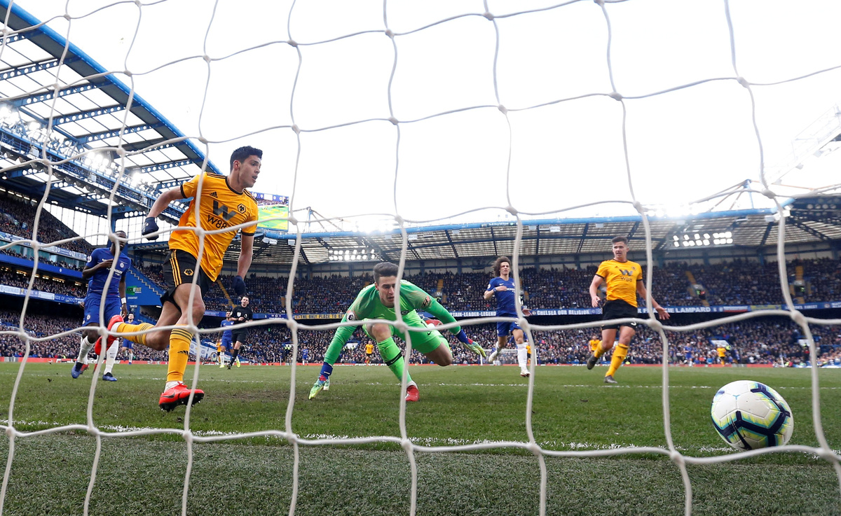 Soccer Football - Premier League - Chelsea v Wolverhampton Wanderers - Stamford Bridge, London, Britain - March 10, 2019 Wolverhampton Wanderers' Raul Jimenez scores their first goal Action Images via Reuters/Matthew Childs