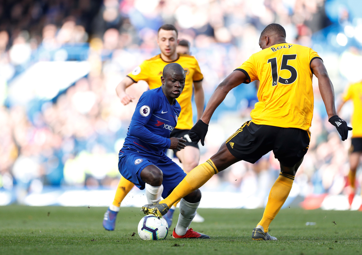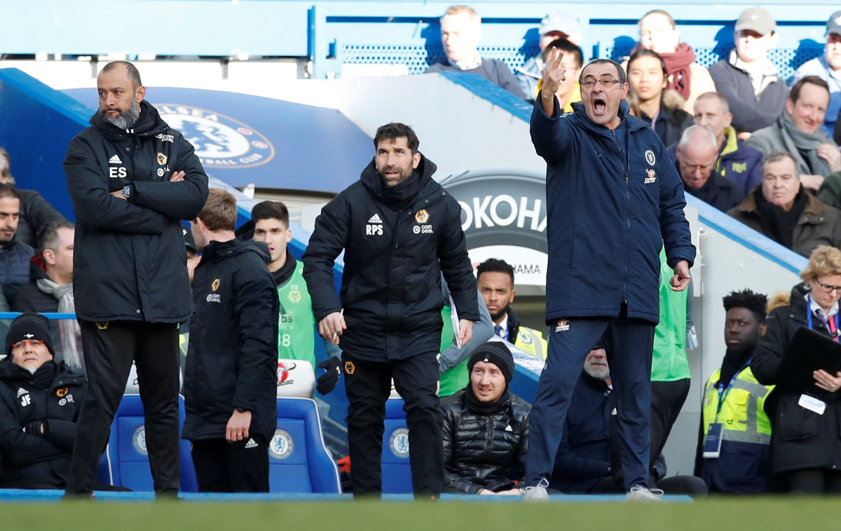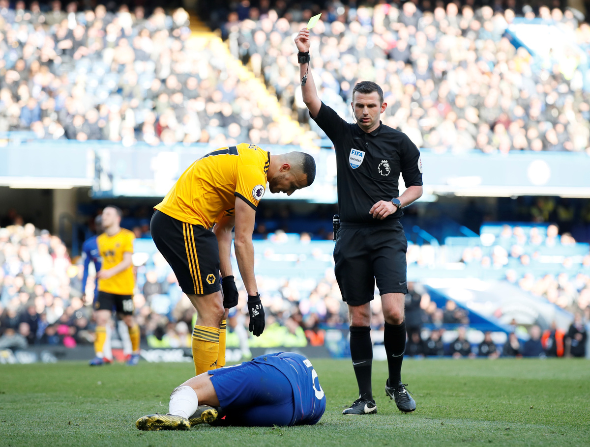 Soccer Football - Premier League - Chelsea v Wolverhampton Wanderers - Stamford Bridge, London, Britain - March 10, 2019 Chelsea manager Maurizio Sarri gestures as Wolverhampton Wanderers manager Nuno Espirito Santo looks on REUTERS/David Klein Soccer Football - Premier League - Chelsea v Wolverhampton Wanderers - Stamford Bridge, London, Britain - March 10, 2019 Wolverhampton Wanderers' Romain Saiss is shown a yellow card by referee MIchael Oliver after fouling Chelsea's Eden Hazard REUTERS/David Klein Soccer Football - Premier League - Chelsea v Wolverhampton Wanderers - Stamford Bridge, London, Britain - March 10, 2019 Chelsea's N'Golo Kante in action with Wolverhampton Wanderers' Willy Boly Action Images via Reuters/Matthew Childs Soccer Football - Premier League - Chelsea v Wolverhampton Wanderers - Stamford Bridge, London, Britain - March 10, 2019 Chelsea's Emerson Palmieri in action with Wolverhampton Wanderers' Leander Dendoncker REUTERS/David Klein
