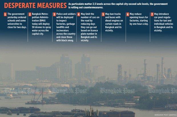 The government has decided to take drastic measures to combat persistent haze caused by ultra-fine dust particles that have shrouded Bangkok and its vicinity, by deploying troops to check on factories and ordering the temporary closure of schools.