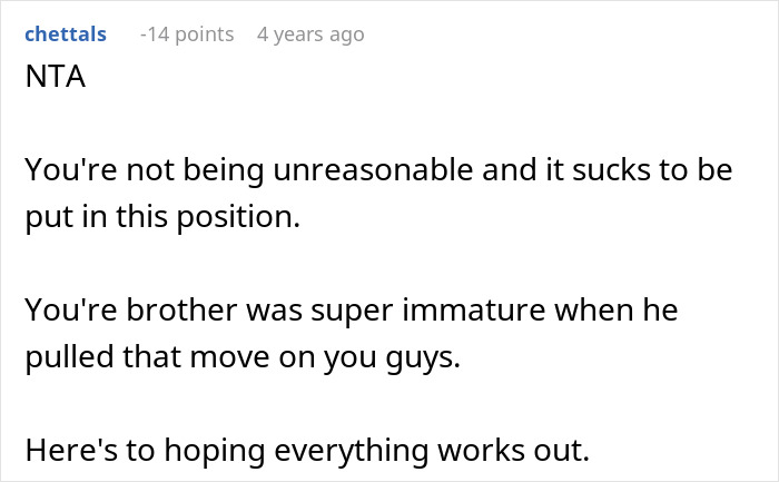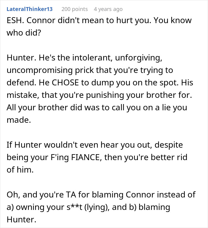 So the woman’s past actions are not necessarily “unforgivable,” but, equally, Hunter might have good reasons for why he can’t move forward with this relationship. However, the crux of the story isn’t actually the past cheating, but her kicking out her brother. In his defense, what he said was dumb, but, equally, how could he have known that this would be such an issue?