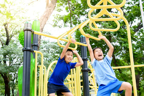 The good news about playgrounds is they’re generally outdoors in parks. The risk of inhaling infectious droplets is reduced because the large volume of air has a dilution effect, compared with being in a confined space indoors with other people. Outdoor breezes can also disperse particles.