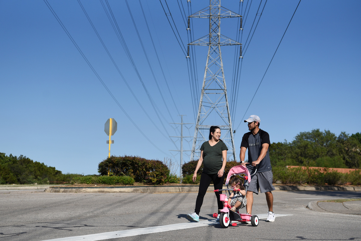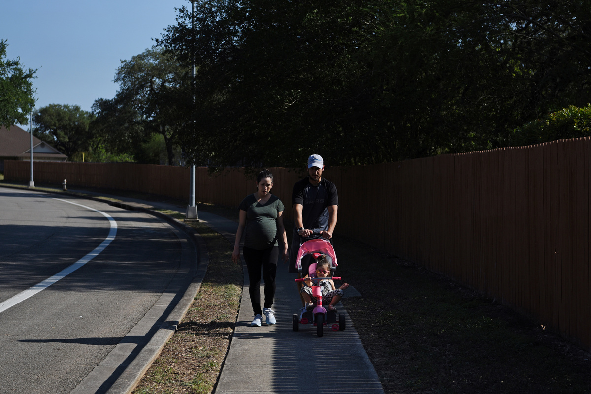 Pregnant nurse Samantha Salinas takes a walk with her husband, Tim, and their daughter, Macie, amid a coronavirus disease (COVID-19) outbreak in San Antonio, Texas, U.S., May 6, 2020. REUTERS/Callaghan O'Hare