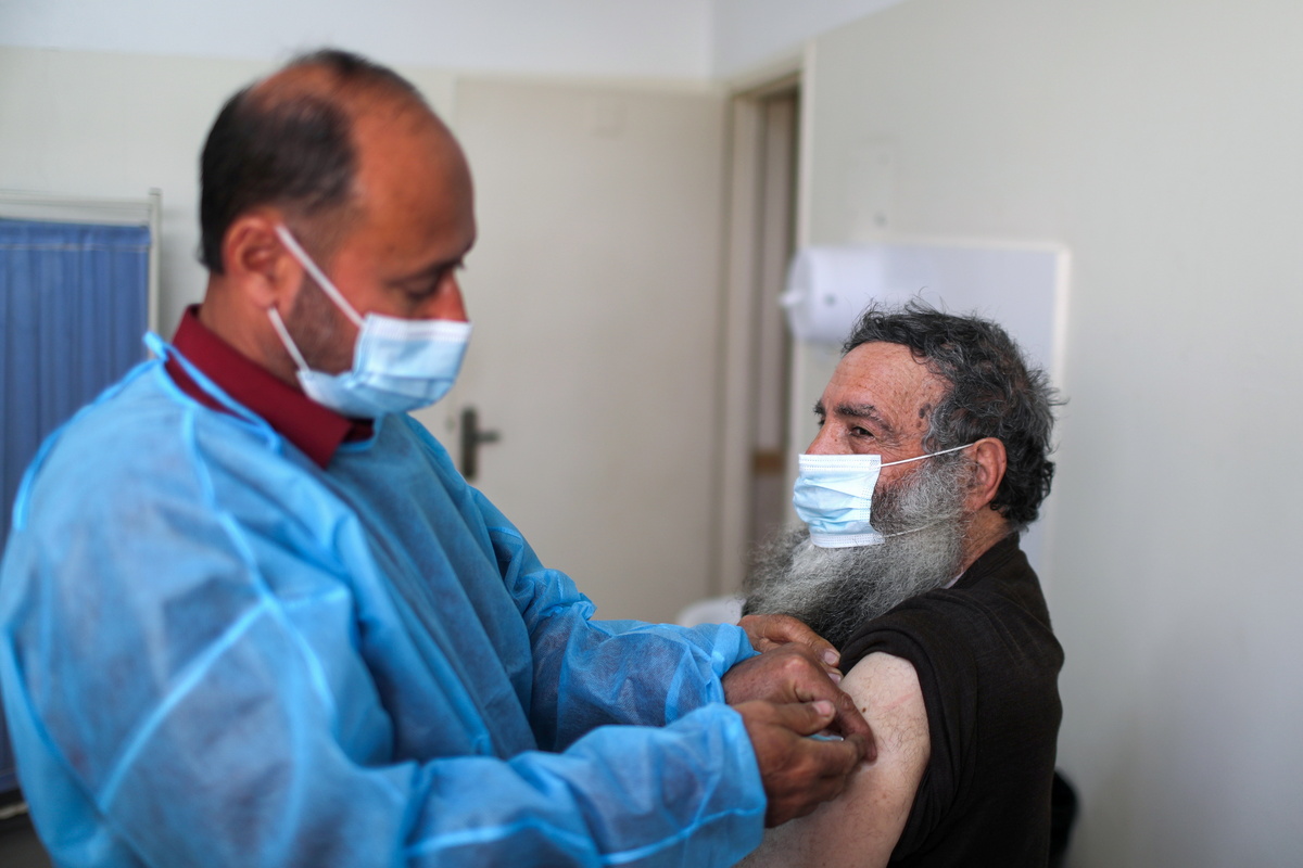On a Gaza street, Ahmed Nasser, 57, leaned against a pro-vaccination mural, painted by youngsters, that depicts a "coronavirus" with jagged teeth trying to tug a woman away from two youths holding her hand.