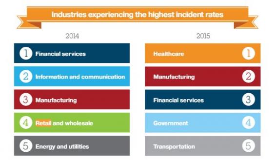 This is part due in to a significant increase in attack activity in the healthcare and manufacturing industries but also because if the improve the financial industry has done to its cyber security in reaction to major breaches over the past several years.