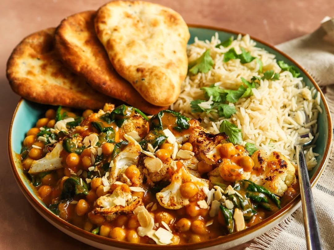 3. Remove from the heat and stir in the yoghurt a spoonful at a time – this will help to prevent it splitting. Once incorporated, return to a low heat and stir in the spinach in batches, cooking until wilted. Serve, garnished with the almonds and coriander, and the rice alongside.