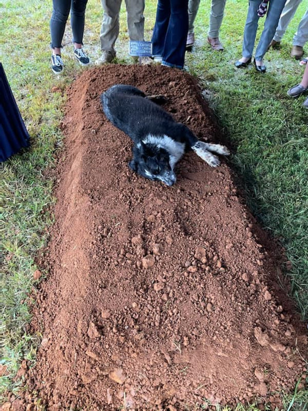 The picture of the grieving dog lying on the grave, freshly dug up for a hurried burial, was shared by the deceased man’s family on Sunday.
