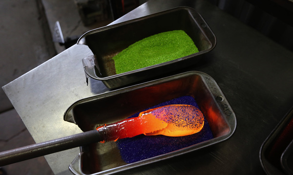 A quick dip into a tray of small, glass particles imparts the color they choose.
