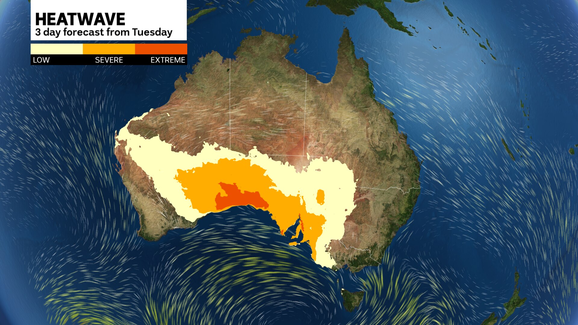 The heatwave will continue across southern inland Australia through Monday and Tuesday, with daily maximus still climbing above 40C from north-west WA to Bourke.