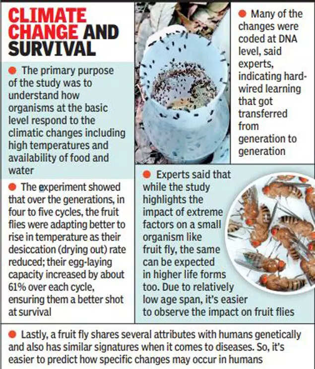 An international study helmed by researchers from Stanford University, University of Pennsylvania, and Ahmedabad University observed drosophila (fruit fly) over a period of four months. In that period, the flies were subjected to different extremes such as lack of food, water, and high temperatures. The experiment underlined evolution in the flies generation after generation, in which every surviving batch was making the next more resilient.