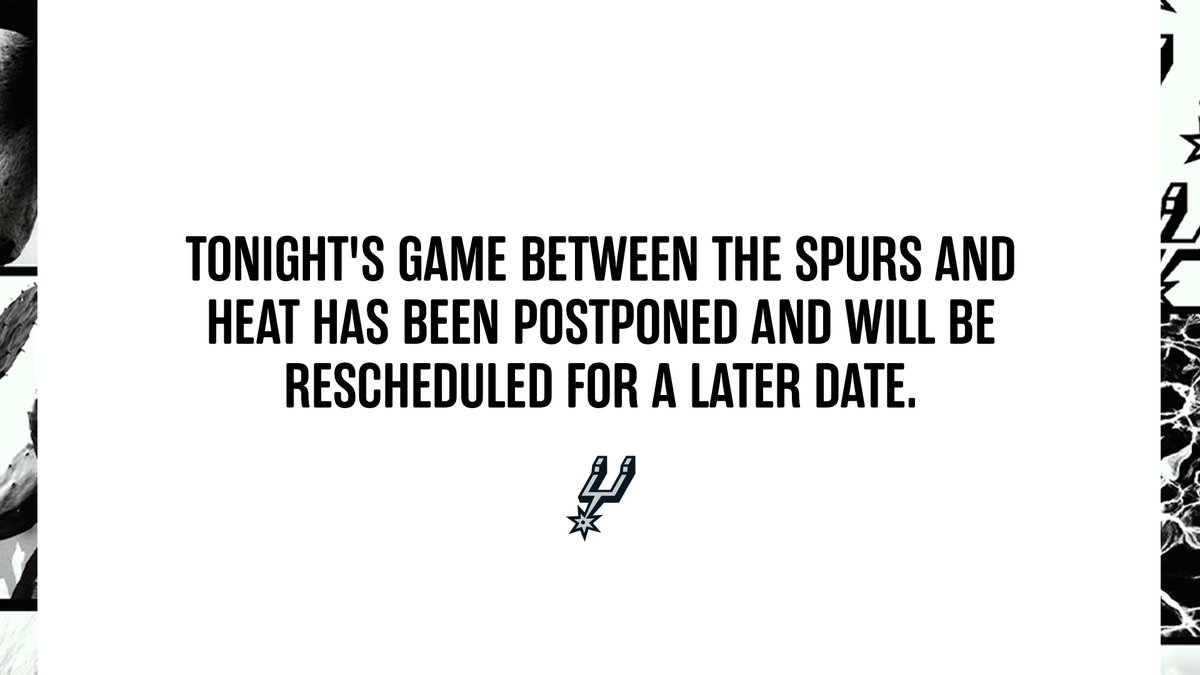 Tonight’s game between the Spurs and Heat has been postponed. Game tickets and parking will be valid for the rescheduled date to be announced.