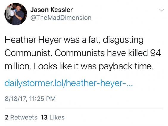 Mr Kessler, who blamed "anti-white hate" for violent clashes between protesters, tweeted: "Heather Heyer was a fat, disgusting Communist. Communists have killed 94 million. Looks like it was payback time."
