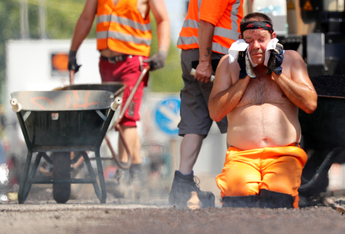 A construction worker cleans his face as he renew the tarmac of a street with bitumen while temperatures reach new record highs in Berlin, Germany, July 25, 2019. REUTERS/Fabrizio Bensch
