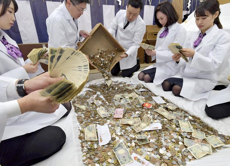 Bank employees clad in white coats begin the process on Saturday of counting the money offered by worshippers at Fushimi Inari Taisha shrine -- known for good luck in business -- over the first three days of the New Year in Fushimi Ward, Kyoto. It will take the group five days to count the vast trove of bills and coins from the 50 collection boxes placed around the shrine complex. The shrine is a popular spot with foreign tourists and an array of foreign bills and coins, such as Chinese renminbi and South Korean won, were among the mix.