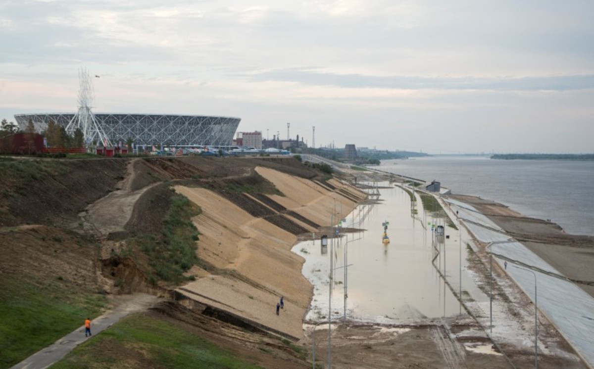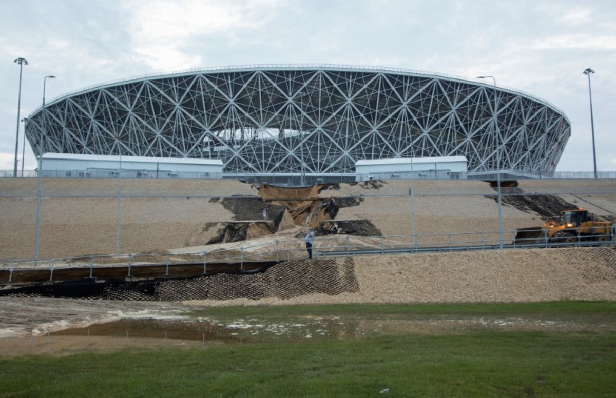 Footage from the southern city of Volgograd showed a fresh landslide on an embankment near the stadium, which made a several-metre-deep hole in it and covered a sidewalk with mud.