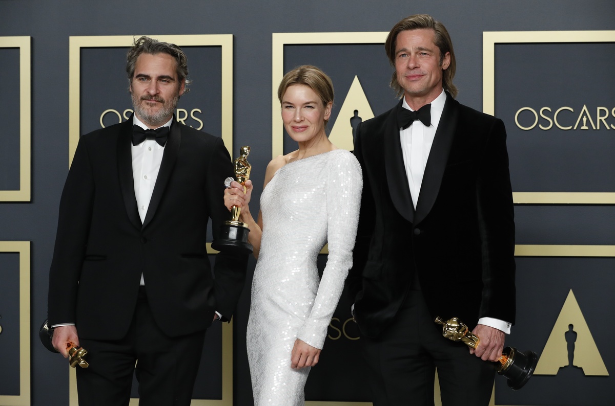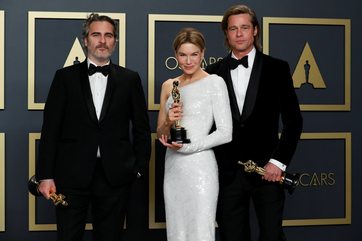 Best Actor winner Joaquin Phoenix, Best Actress Renee Zellweger and Best Supporting Actor Brad Pitt pose with their Oscars in the photo room during the 92nd Academy Awards in Hollywood, Los Angeles, California, U.S., February 9, 2020. REUTERS/Lucas Jackson
