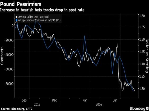 A Bloomberg analysis of futures and options contracts in sterling held by hedge funds and other large asset managers shows a heavy weight of money betting against the British currency in the week to 9 August.