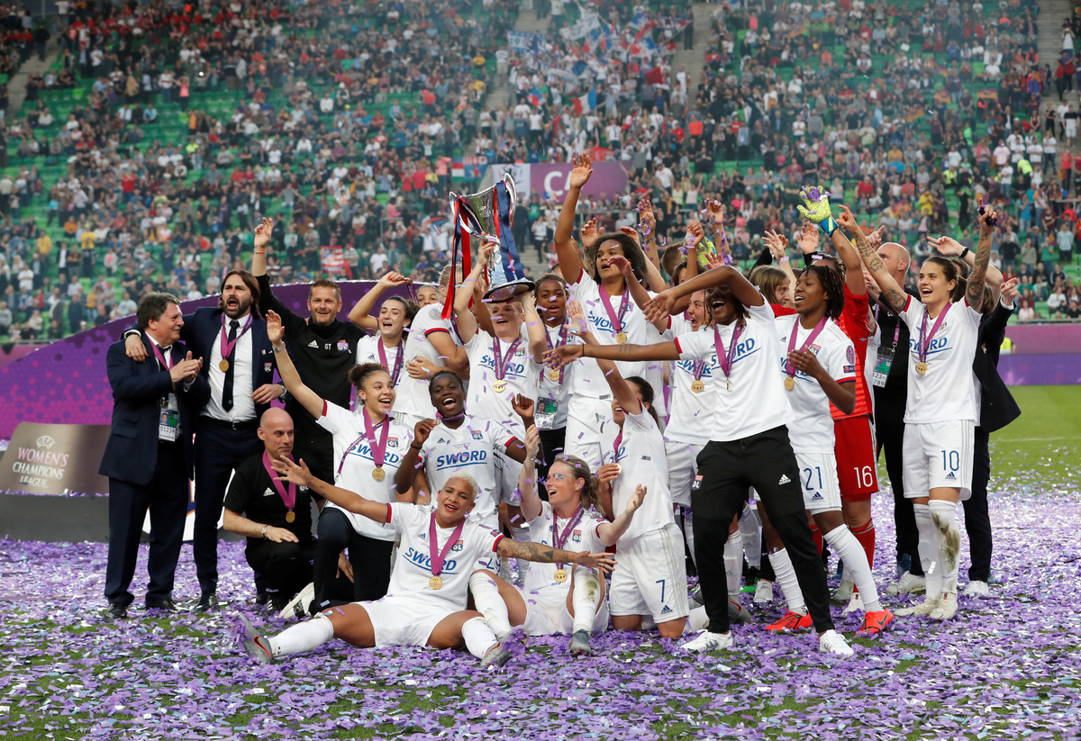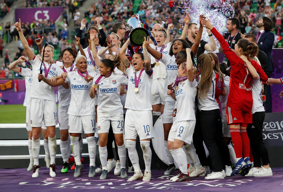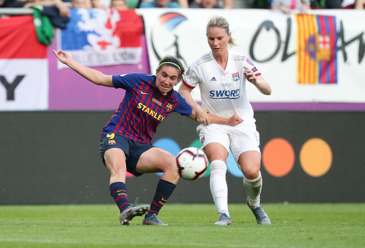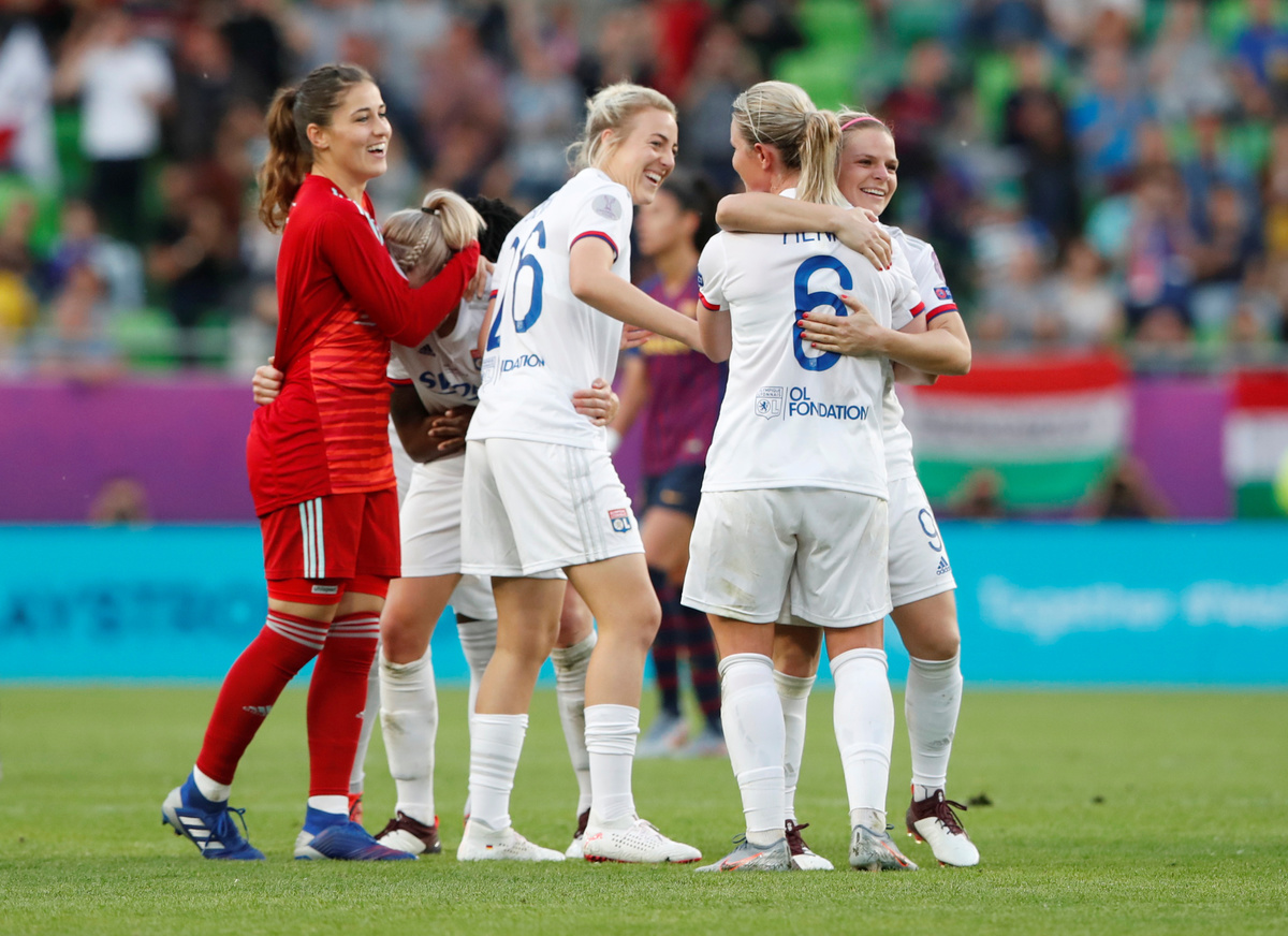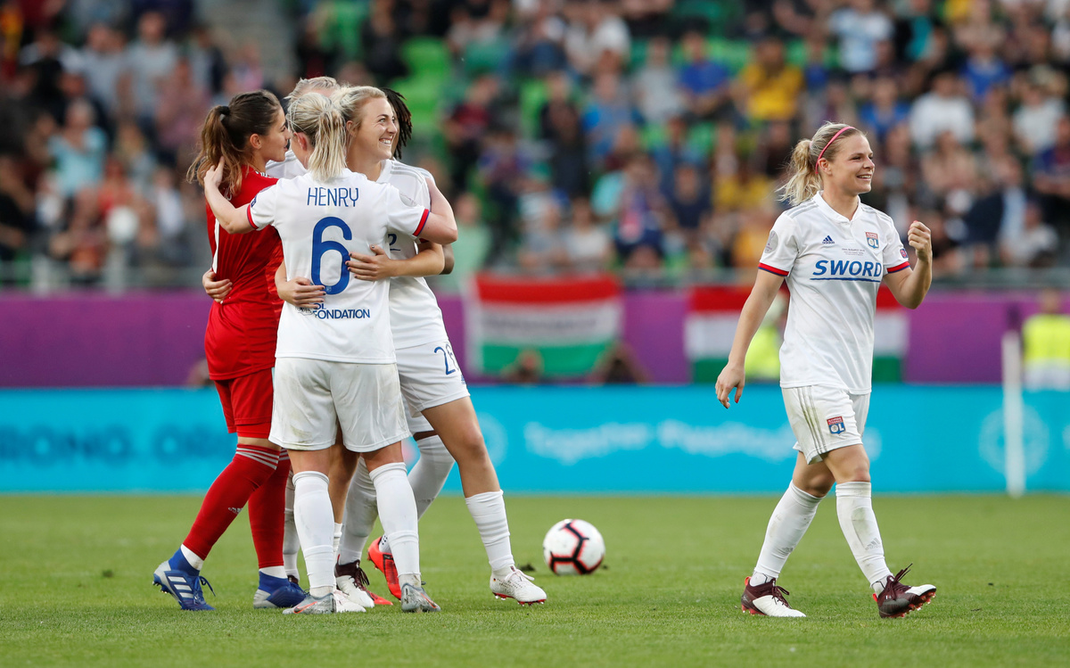 Soccer Football - Women's Champions League Final - Ferencvaros Stadium, Budapest, Hungary - May 18, 2019 Olympique Lyonnais' Amandine Henry and Carolin Simon celebrate winning the Women's Champions League REUTERS/Lisi NiesnerSoccer Football - Women's Champions League Final - Ferencvaros Stadium, Budapest, Hungary - May 18, 2019 Olympique Lyonnais' Jess Fishlock in action with Barcelona's Andrea Pereira REUTERS/Lisi NiesnerSoccer Football - Women's Champions League Final - Ferencvaros Stadium, Budapest, Hungary - May 18, 2019 Olympique Lyonnais' Eugenie Le Sommer in action with Barcelona's Aitana Bonmati and Mariona Caldentey REUTERS/Lisi NiesnerSoccer Football - Women's Champions League Final - Ferencvaros Stadium, Budapest, Hungary - May 18, 2019 Olympique Lyonnais' Wendie Renard celebrates winning the Women's Champions League with Jess Fishlock after the match REUTERS/Bernadett SzaboSoccer Football - Women's Champions League Final - Ferencvaros Stadium, Budapest, Hungary - May 18, 2019 Olympique Lyonnais' Dzsenifer Marozsan and team mates celebrate winning the Women's Champions League final with the trophy REUTERS/Bernadett SzaboSoccer Football - Women's Champions League Final - Ferencvaros Stadium, Budapest, Hungary - May 18, 2019 Olympique Lyonnais' Jess Fishlock celebrates winning the Women's Champions League with team mates REUTERS/Lisi NiesnerSoccer Football - Women's Champions League Final - Ferencvaros Stadium, Budapest, Hungary - May 18, 2019 Barcelona's Toni Duggan in action with Olympique Lyonnais' Griedge Mbock REUTERS/Bernadett SzaboSoccer Football - Women's Champions League Final - Ferencvaros Stadium, Budapest, Hungary - May 18, 2019 Barcelona's Aitana Bonmati and team mates look dejected with their medals after losing the Women's Champions League final REUTERS/Bernadett SzaboSoccer Football - Women's Champions League Final - Ferencvaros Stadium, Budapest, Hungary - May 18, 2019 Olympique Lyonnais' Amandine Henry celebrates winning the Women's Champions League with team mates after the match REUTERS/Bernadett SzaboSoccer Football - Women's Champions League Final - Ferencvaros Stadium, Budapest, Hungary - May 18, 2019 Barcelona's Asisat Oshoala scores their first goal REUTERS/Lisi NiesnerSoccer Football - Women's Champions League Final - Ferencvaros Stadium, Budapest, Hungary - May 18, 2019 Olympique Lyonnais' Jess Fishlock in action with Barcelona's Andrea Pereira REUTERS/Lisi NiesnerSoccer Football - Women's Champions League Final - Ferencvaros Stadium, Budapest, Hungary - May 18, 2019 Olympique Lyonnais' Amandine Henry celebrates winning the Women's Champions League with team mates after the match .REUTERS/Bernadett SzaboSoccer Football - Women's Champions League Final - Ferencvaros Stadium, Budapest, Hungary - May 18, 2019 Barcelona's Aitana Bonmati in action with Olympique Lyonnais' Dzsenifer Marozsan REUTERS/Bernadett Szabo