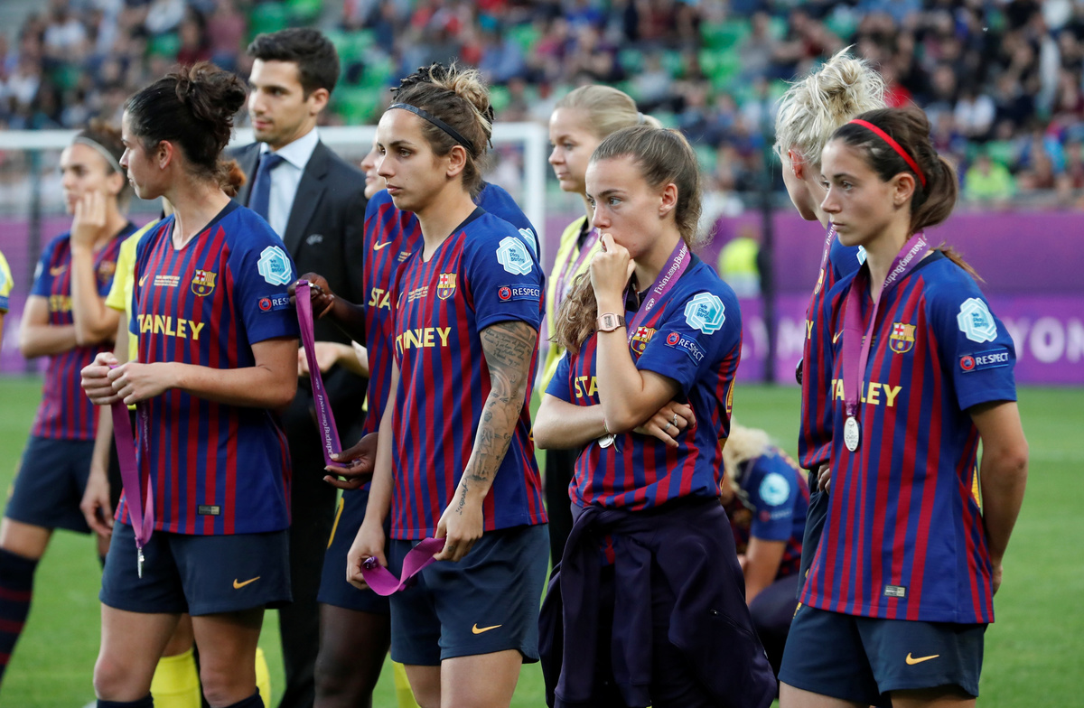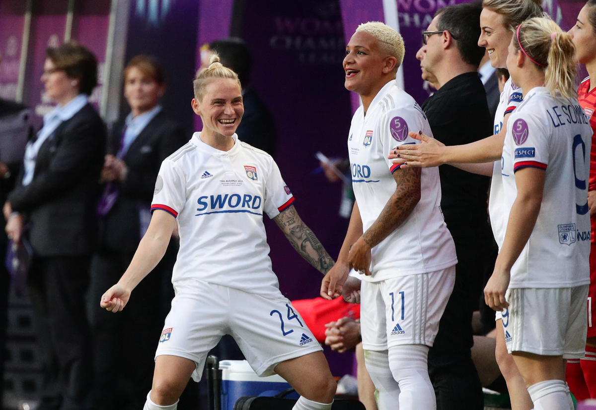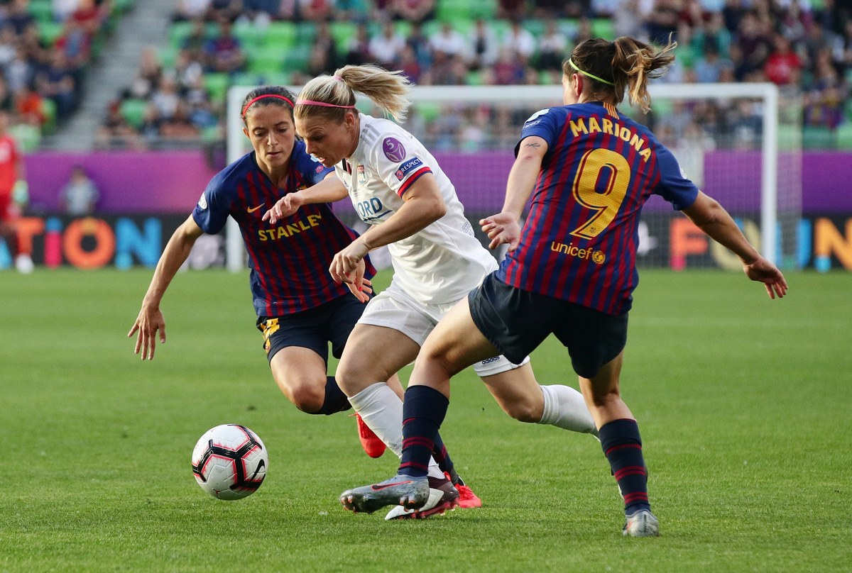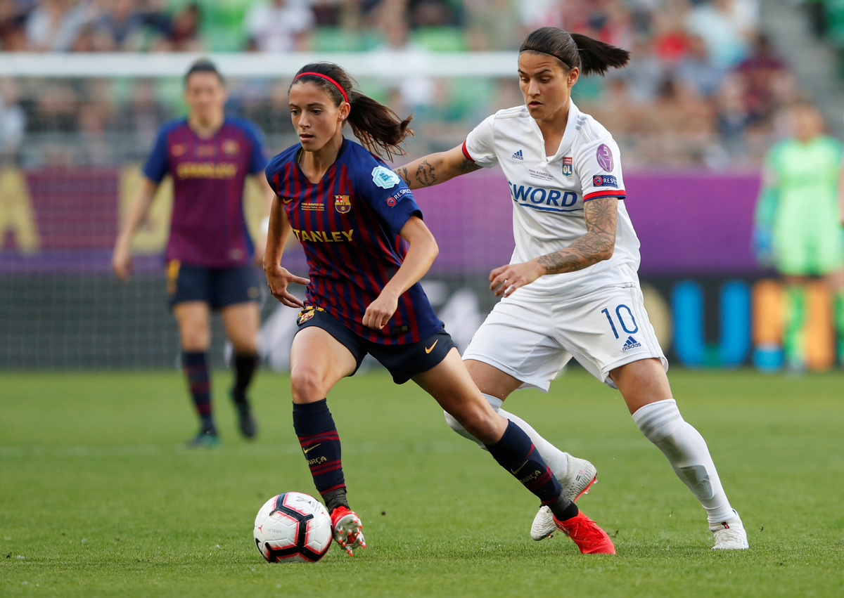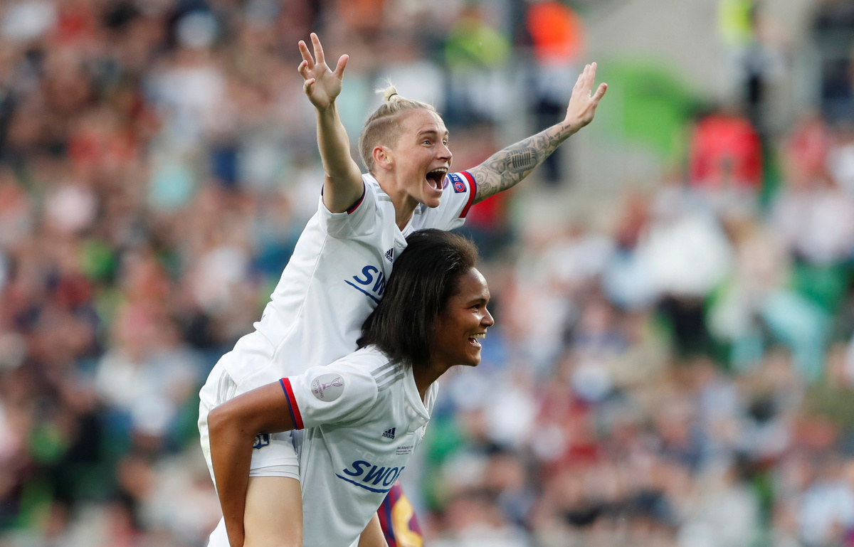Soccer Football - Women's Champions League Final - Ferencvaros Stadium, Budapest, Hungary - May 18, 2019 Olympique Lyonnais' Amandine Henry and Carolin Simon celebrate winning the Women's Champions League REUTERS/Lisi NiesnerSoccer Football - Women's Champions League Final - Ferencvaros Stadium, Budapest, Hungary - May 18, 2019 Olympique Lyonnais' Jess Fishlock in action with Barcelona's Andrea Pereira REUTERS/Lisi NiesnerSoccer Football - Women's Champions League Final - Ferencvaros Stadium, Budapest, Hungary - May 18, 2019 Olympique Lyonnais' Eugenie Le Sommer in action with Barcelona's Aitana Bonmati and Mariona Caldentey REUTERS/Lisi NiesnerSoccer Football - Women's Champions League Final - Ferencvaros Stadium, Budapest, Hungary - May 18, 2019 Olympique Lyonnais' Wendie Renard celebrates winning the Women's Champions League with Jess Fishlock after the match REUTERS/Bernadett SzaboSoccer Football - Women's Champions League Final - Ferencvaros Stadium, Budapest, Hungary - May 18, 2019 Olympique Lyonnais' Dzsenifer Marozsan and team mates celebrate winning the Women's Champions League final with the trophy REUTERS/Bernadett SzaboSoccer Football - Women's Champions League Final - Ferencvaros Stadium, Budapest, Hungary - May 18, 2019 Olympique Lyonnais' Jess Fishlock celebrates winning the Women's Champions League with team mates REUTERS/Lisi NiesnerSoccer Football - Women's Champions League Final - Ferencvaros Stadium, Budapest, Hungary - May 18, 2019 Barcelona's Toni Duggan in action with Olympique Lyonnais' Griedge Mbock REUTERS/Bernadett SzaboSoccer Football - Women's Champions League Final - Ferencvaros Stadium, Budapest, Hungary - May 18, 2019 Barcelona's Aitana Bonmati and team mates look dejected with their medals after losing the Women's Champions League final REUTERS/Bernadett SzaboSoccer Football - Women's Champions League Final - Ferencvaros Stadium, Budapest, Hungary - May 18, 2019 Olympique Lyonnais' Amandine Henry celebrates winning the Women's Champions League with team mates after the match REUTERS/Bernadett SzaboSoccer Football - Women's Champions League Final - Ferencvaros Stadium, Budapest, Hungary - May 18, 2019 Barcelona's Asisat Oshoala scores their first goal REUTERS/Lisi NiesnerSoccer Football - Women's Champions League Final - Ferencvaros Stadium, Budapest, Hungary - May 18, 2019 Olympique Lyonnais' Jess Fishlock in action with Barcelona's Andrea Pereira REUTERS/Lisi NiesnerSoccer Football - Women's Champions League Final - Ferencvaros Stadium, Budapest, Hungary - May 18, 2019 Olympique Lyonnais' Amandine Henry celebrates winning the Women's Champions League with team mates after the match .REUTERS/Bernadett SzaboSoccer Football - Women's Champions League Final - Ferencvaros Stadium, Budapest, Hungary - May 18, 2019 Barcelona's Aitana Bonmati in action with Olympique Lyonnais' Dzsenifer Marozsan REUTERS/Bernadett Szabo