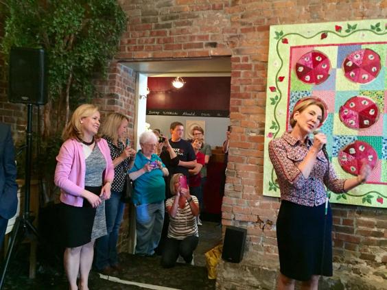 Ms Cruz and Ms Fiorina both spoke in front of a colourful quilt hanging from the wall of the restaurant, and a modest, nodding crowd. Ms Cruz said her husband had proved he was a man of word.