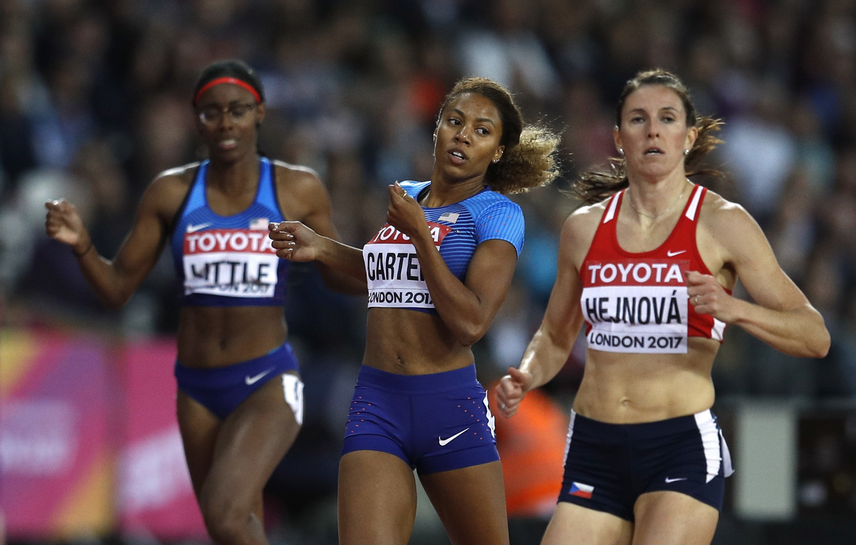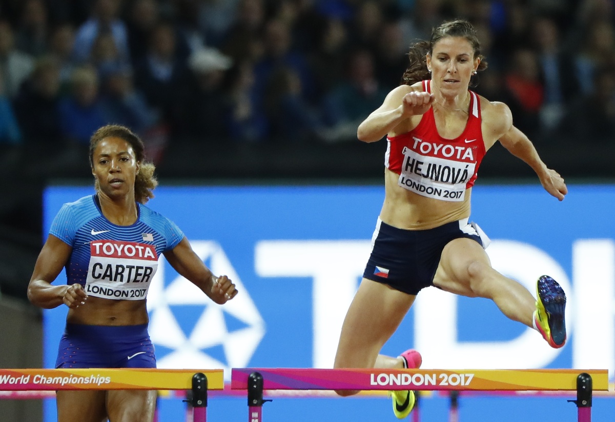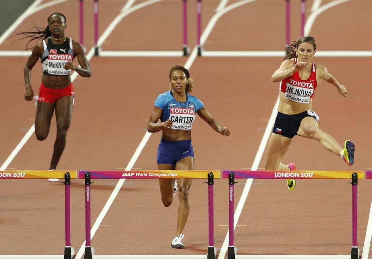 Athletics - World Athletics Championships – women’s 400 hurdles metres semi-final – London Stadium, London, Britain – August 8, 2017 – Kori Carter of the U.S. and Zuzana Hejnova of the Czech Republic compete. REUTERS/John SibleyAthletics - World Athletics Championships – women's 400 metres hurdles semi-final – London Stadium, London, Britain – August 8, 2017 – Zuzana Hejnova of the Czech Republic and Kori Carter of the U.S. compete. REUTERS/Lucy Nicholson