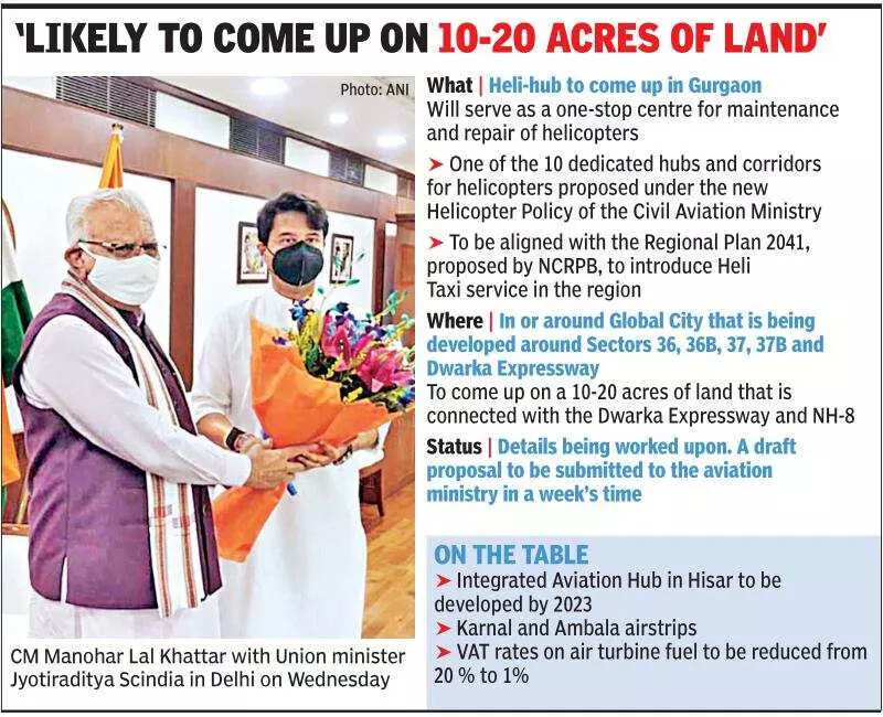 “It was a happy coincidence that our vision to set up a helicopter hub in Gurugram has aligned with the new helicopter policy of the Centre under which around 10 heli-hubs will be set up. It is a great honour and opportunity that the civil aviation minister has selected Gurugram to be one of the dedicated hubs to not only facilitate commercial operations but also for maintenance and operations of helicopters,” a senior government official told TOI.