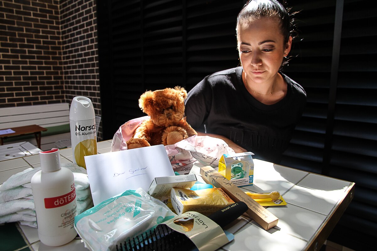 )In the bag are toiletries and notebooks, pens, a children's storybook and nappies, things to get you through a rough time, especially the first 24 hours.