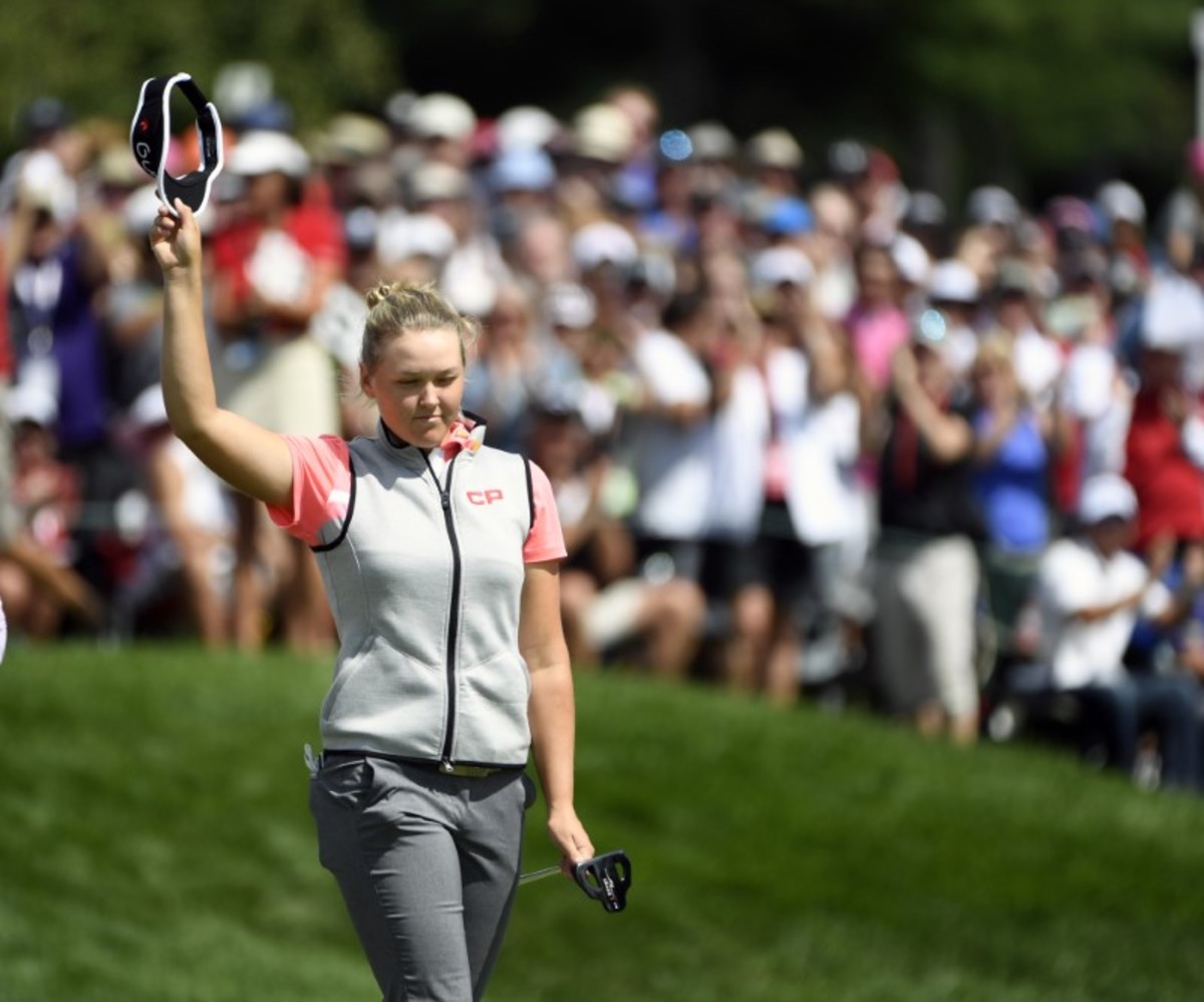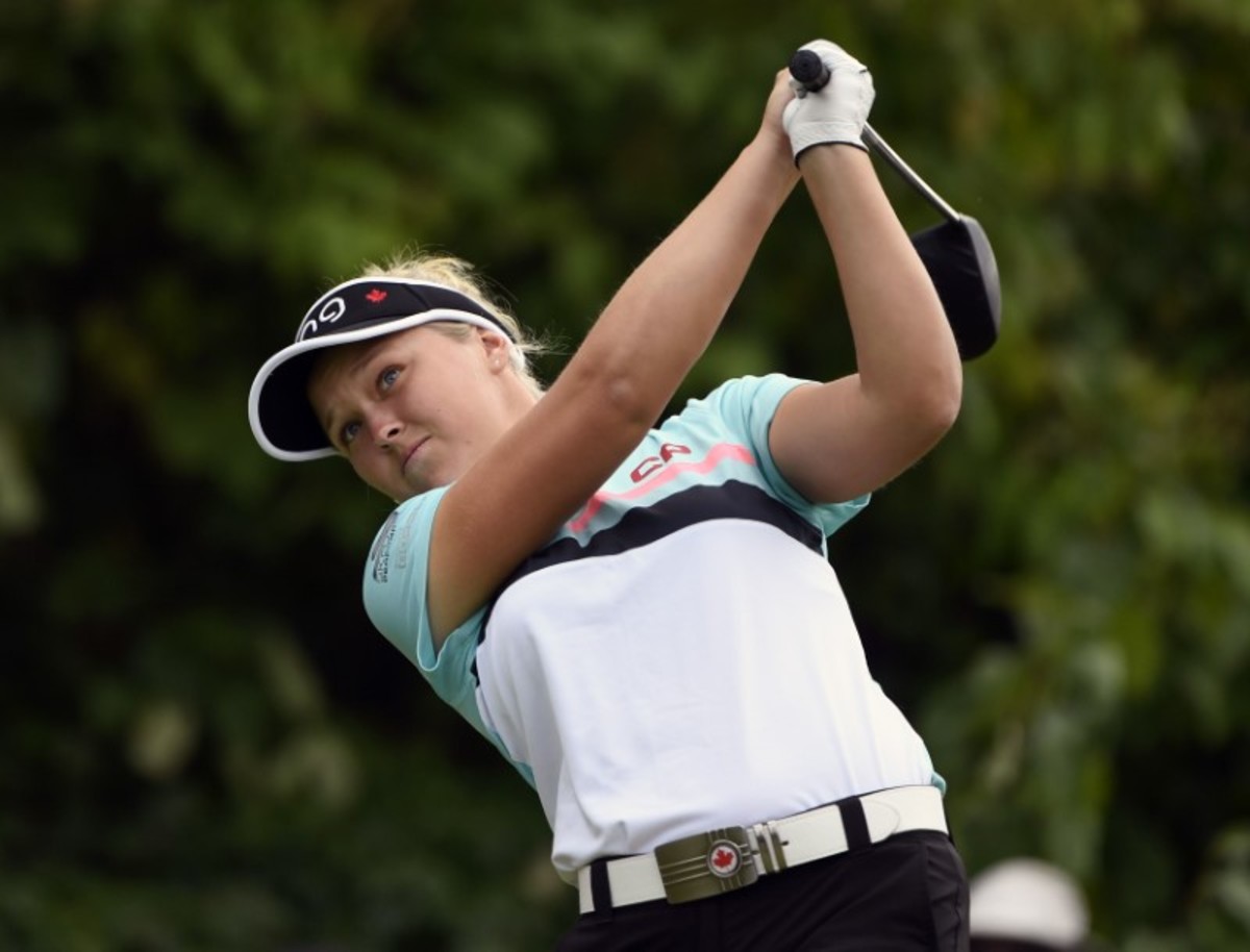 (Reuters) - Canada's Brooke Henderson battled another day of windy conditions on Saturday to finish her second round five-under par overall and with a one-stroke lead at the season-opening Pure Silk-Bahamas LPGA Classic.