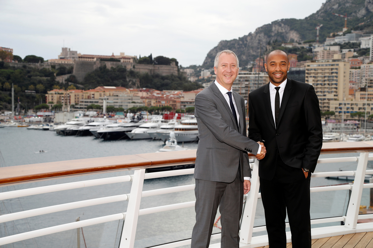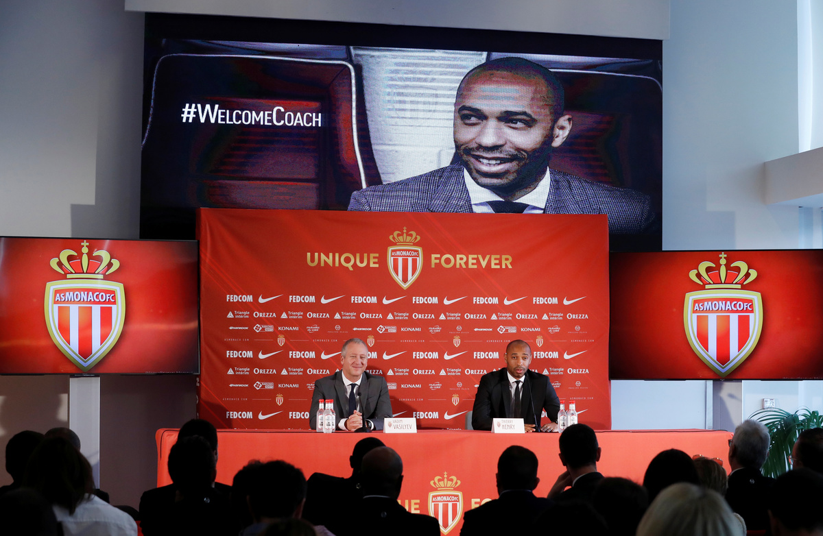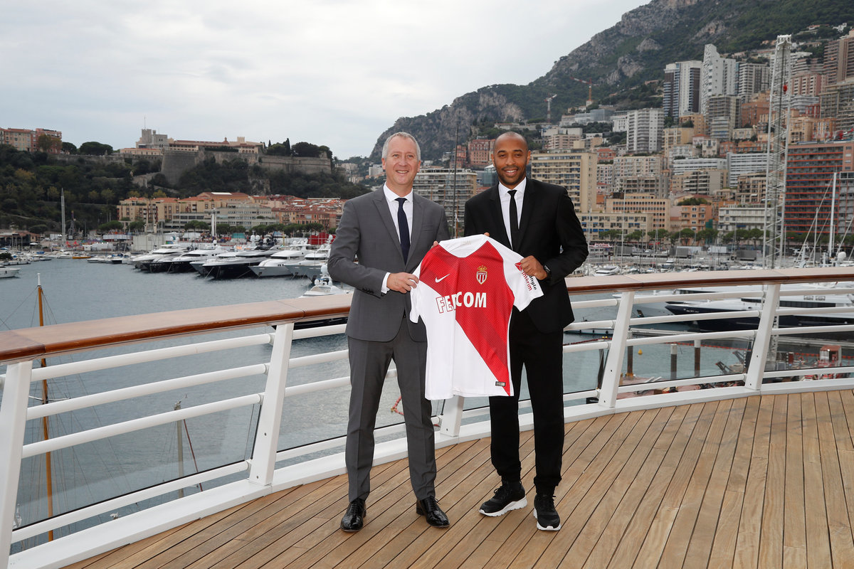 Soccer Football - Ligue 1 - AS Monaco - Thierry Henry Press Conference - Yacht Club de Monaco, Monaco - October 17, 2018 New AS Monaco head coach Thierry Henry and AS Monaco Vice President Vadim Vasilyev pose for a photograph with the club shirt REUTERS/Eric GaillardSoccer Football - Ligue 1 - AS Monaco - Thierry Henry Press Conference - Yacht Club de Monaco, Monaco - October 17, 2018 New AS Monaco head coach Thierry Henry and AS Monaco Vice President Vadim Vasilyev during the press conference REUTERS/Eric GaillardSoccer Football - Ligue 1 - AS Monaco - Thierry Henry Press Conference - Yacht Club de Monaco, Monaco - October 17, 2018 New AS Monaco head coach Thierry Henry during the press conference REUTERS/Eric Gaillard