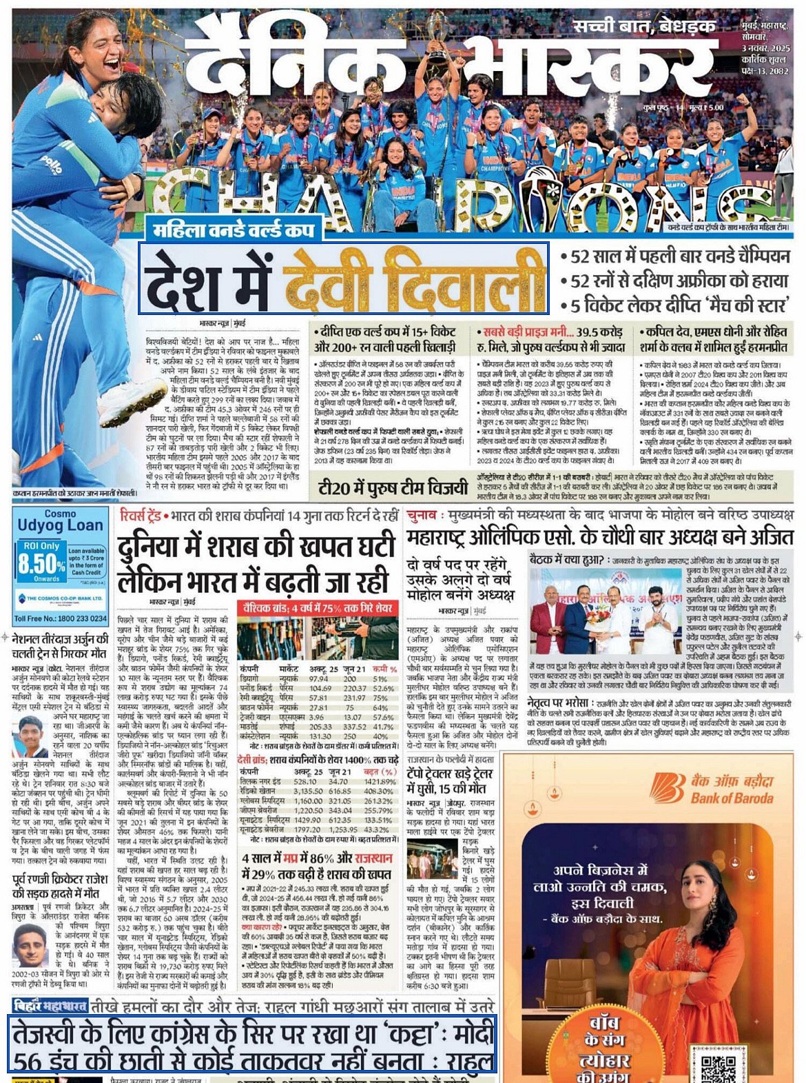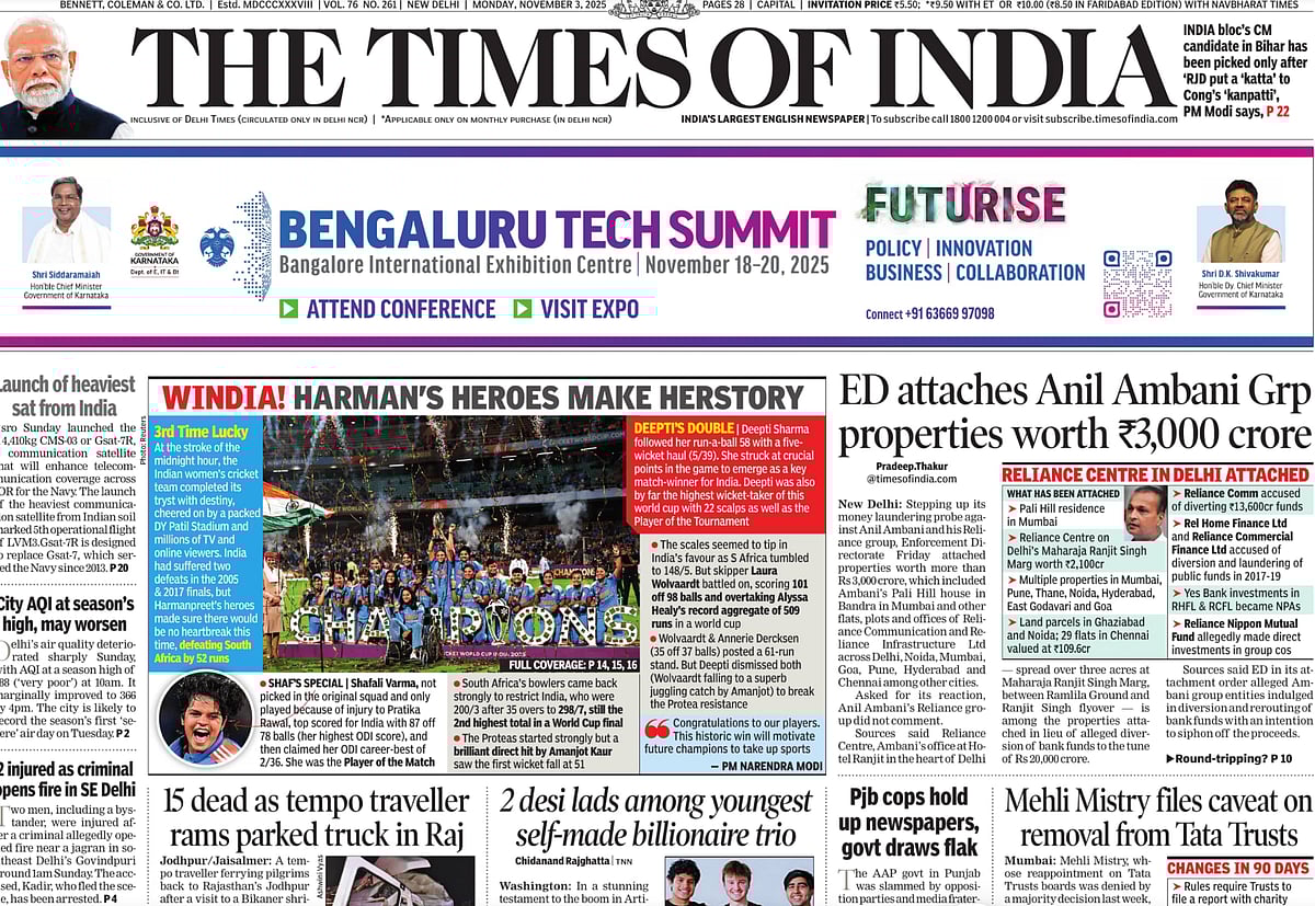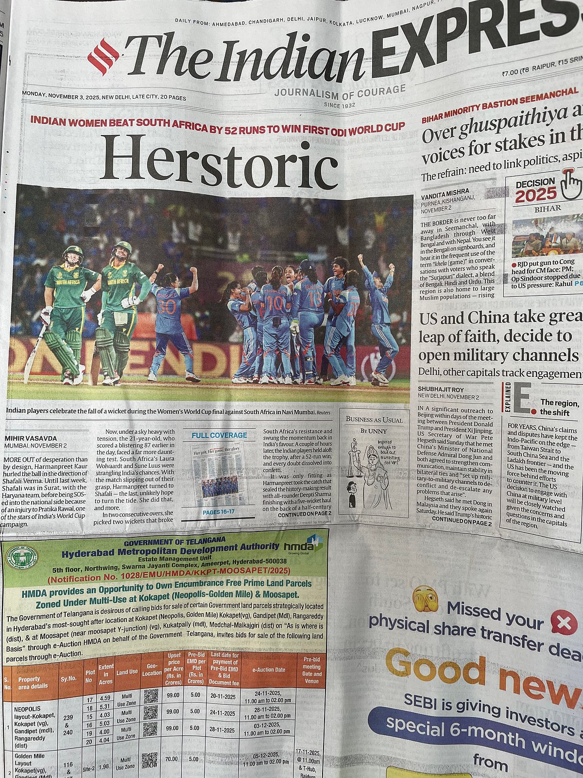 The Times of India chose celebration with the lead headline: “Windia! Harman’s heroes make herstory.” The front flaps carried congratulatory brand ads riding the national cheer.