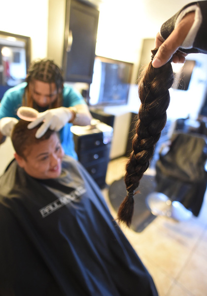Barber Cesar Gutierrez pulled up the braided ponytail that had hung mid-back, and snipped.