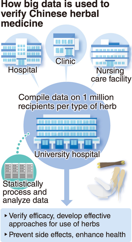The government plans to use big data to examine the efficacy and side effects of Chinese herbal medicine, known as kampo in Japanese, as early as next year, collecting information on about 1 million recipients per medication for analysis, according to sources.