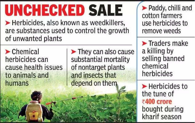 AMARAVATI: With agriculture activity picking up across the state due to good rains, the demand for regulated herbicides too has picked up. The state is likely to witness close to Rs 400 crore of herbicides sale during the current season. What’s, however, worrying is the laxity on the part of agriculture department officials to regulate the sale, due to which dealers are openly selling stocks, thereby causing damage to the health of humans as well as the environment.
