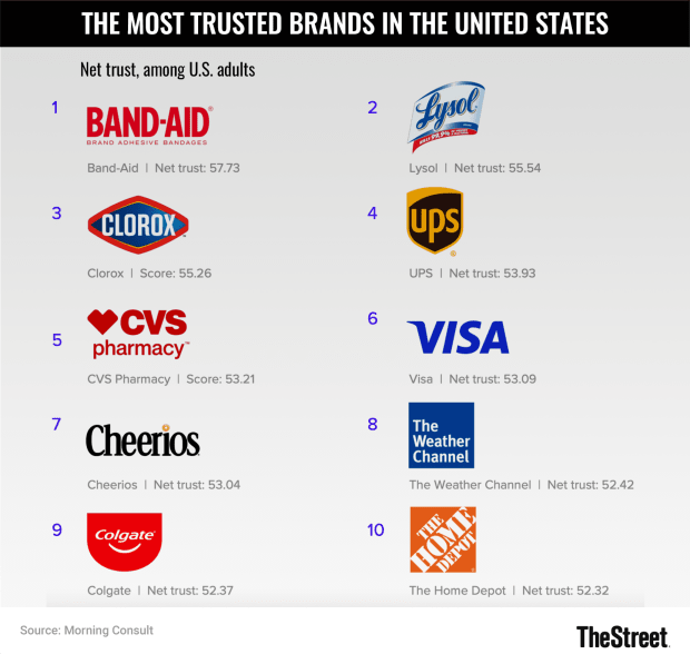 In its annual round-up of trusted brands, intelligence company Morning Consult found that Americans tend to trust brands that make various health and disinfecting products: Johnson & Johnson's (JNJ) Band-Aid topped the list of most trusted brand in the country.