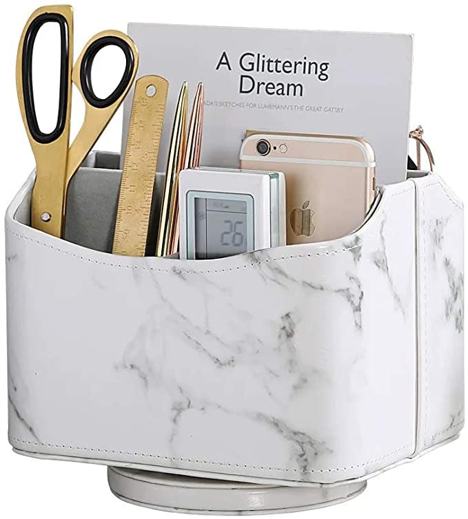 Five compartments hold everything from remotes to phones, to pens and office supplies, keeping them upright and visible. This rotating organizer brings quick, easy-to-access order to the coffee table, desk, bedside table, or kitchen. Just choose a pattern and texture that suits the environment and set it down. There are 19 looks to choose from that include everything from linen and leather to marble.